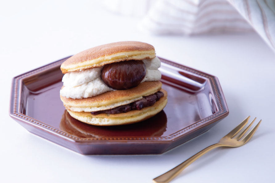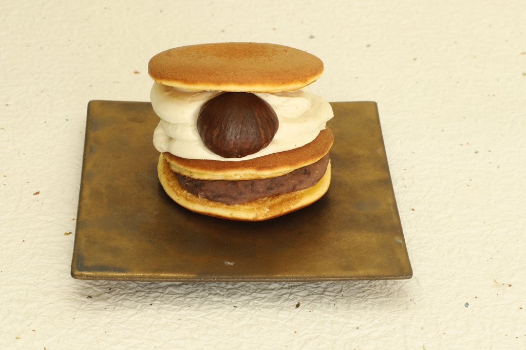 ふわふわ・しっとりしたどら焼きの生地、二日間かけて炊き上げた自家製の粒餡、栗ペースト・生クリーム・白餡・ラム酒が見事なまでに調和したたっぷりのクリーム、最後に主役の渋皮栗を丸ごと入れて完成です。